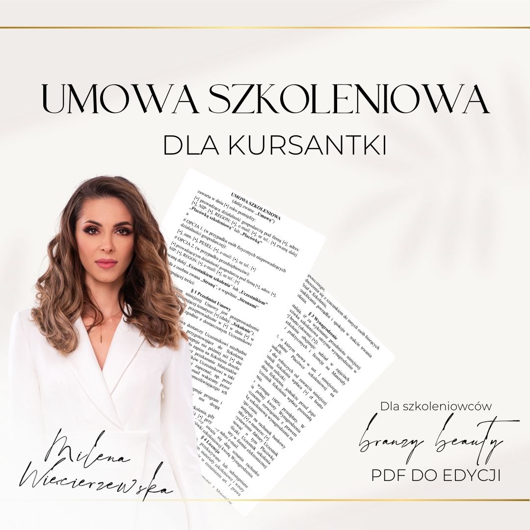 Podsumowując, umowa zawarta pomiędzy instruktorem a kursantką jest jednym z najważniejszych elementów w prowadzeniu działalności szkoleniowej w branży beauty. To nie tylko formalność, ale narzędzie, które zabezpiecza Twój biznes, wiedzę i renomę na rynku. Skorzystanie z naszego pliku PDF, który możesz dostosować do swoich indywidualnych potrzeb, to krok w stronę świadomego i profesjonalnego prowadzenia szkoleń – zgodnie z najwyższymi standardami prawnymi i etycznymi. Jeśli będziesz potrzebować pomocy w dopasowaniu pliku do Twoich potrzeb wystarczy, że skorzystasz z porady prawnej naszego prawnika (do którego kontakt otrzymujesz wraz z plikiem pdf), który stworzył niniejszy dokument więc wszystko masz w jednym miejscu.